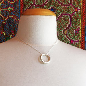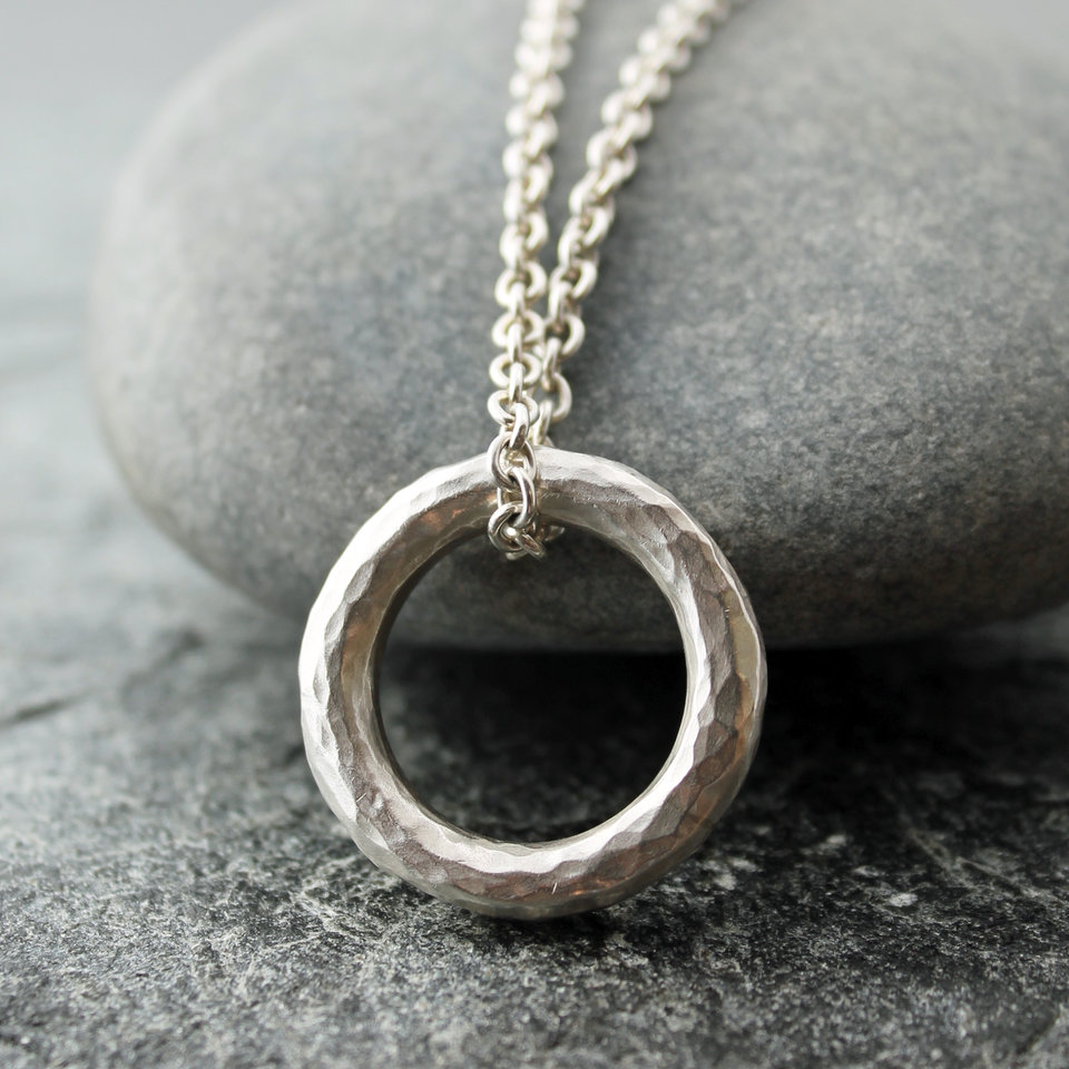 A stunningly simple yet substantial hammered sterling silver circle necklace, hand forged in the heart of the Spiral River, from 5mm diameter solid sterling silver. The sterling silver circle is about 1 1/8th" in diameter and hangs from your choice of a 2mm thick adjustable leather cord or sterling cable chain (first photo).