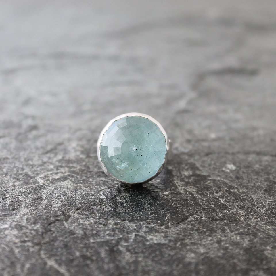 Blue Moon Aquamarine Ring with Hammered Sterling Silver Band, US Size 8