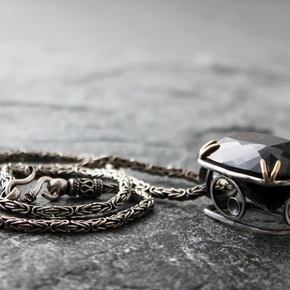 Indulge in this amazing and rare Rainbow Tourmaline Statement Necklace. The stone is set in a hand-crafted, oxidized sterling silver frame featuring bubbles and circles, with 14k gold prongs holding the stone in place. The whole pendant is 35.33mm tall x 24.82mm wide x 20.91mm deep. You can order this as just the pendant or with the 18.25" sterling silver byzantine chain shown here. The inside of the bail is about 5.7mm in diameter, so if you want to put this on your own chain please make sure one end of the chain will fit through the bail.